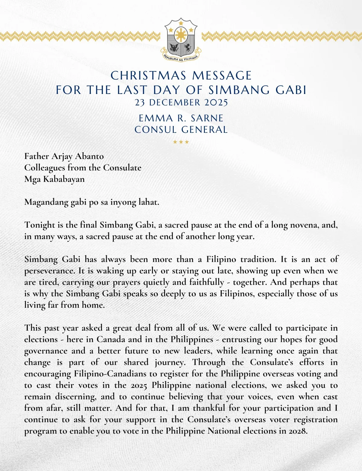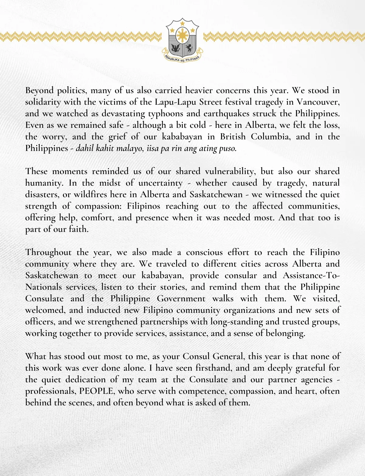 We would like to share with our kababayans in Alberta & Saskatchewan the message delivered by Consul General Emma R. Sarne during the last day of Simbang Gabi at Sacred Heart Catholic Church, Calgary last 23 December 2025, which is fitting message to cap your Philippine Consulate General in Calgary’s year of service in 2025.