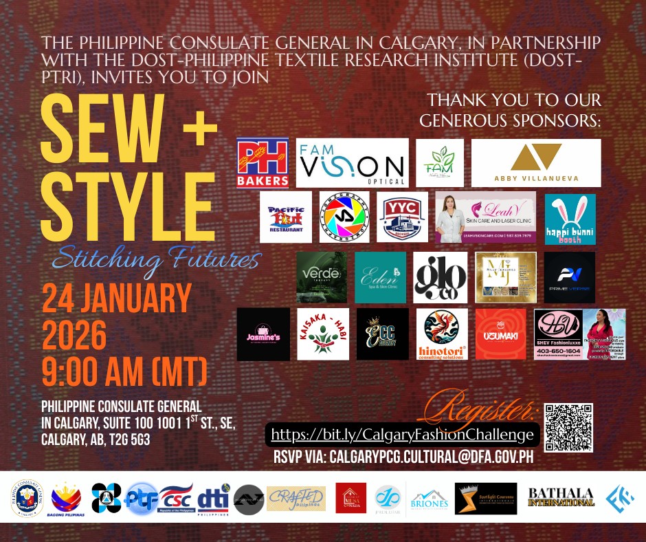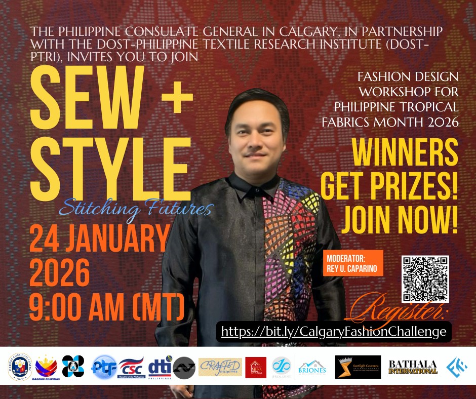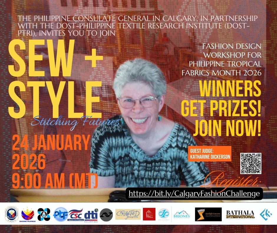 SAVE THE DATE: Join the Philippine Consulate General in Calgary for a vibrant two-day celebration of Philippine heritage and sustainable fashion. Day 1 (Jan 23, hybrid): Vernissage featuring experts on indigenous weaves like Sagada, Pis Yabit, Yakan, and T’nalak, plus piña, abaca, and more. Day 2 (Jan 24, in-person): Sew+Style Calgary Fashion Challenge with hands-on workshop led by designer Maliyah Abenir.