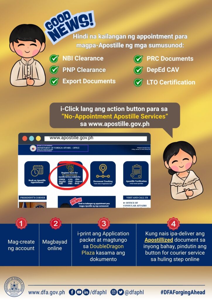 Welcome to the DFA Online Apostille Appointment System. Please be informed that the DFA with authentication services are accepting applicants through ONLINE APPOINTMENT (through this website)