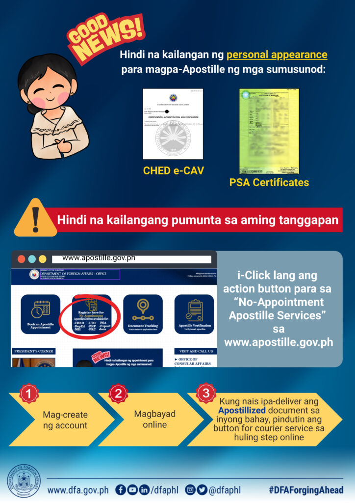Note: Certifications for documents issued by Philippine Embassies/Consulates and Foreign Embassies in the Philippines may only be done at DFA Aseana