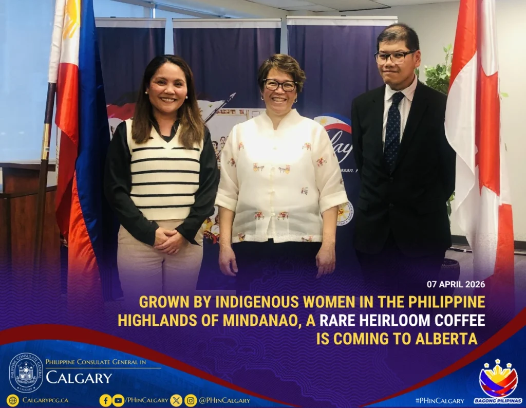 Consul General Emma R. Sarne and Deputy Consul General Victorio Mario M. Dimagiba Jr. met with Ms. Sonia Gonzales, Founder of Grounded Partners Inc (GPI), at the Philippine Consulate General in Calgary on 7 April 2026 to explore a collaboration that would bring Philippine heirloom coffee to the Canadian market.