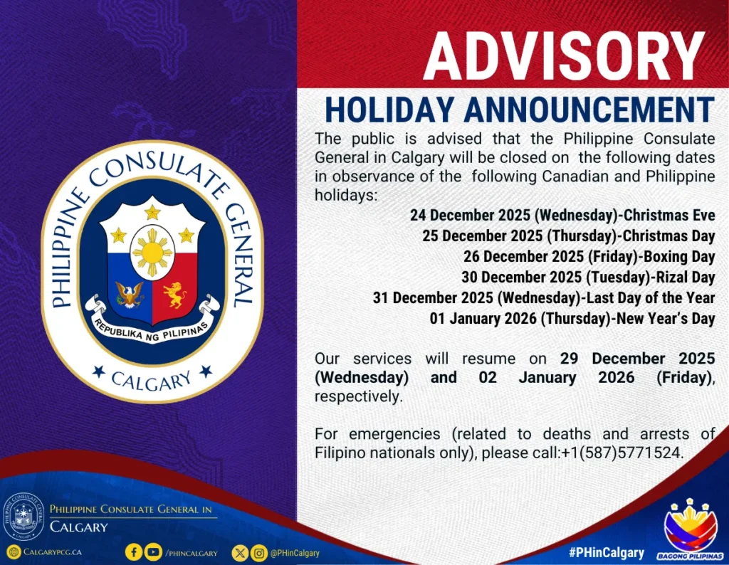 The public is advised that the Philippine Consulate General in Calgary will be closed on the following dates in observance of Canadian and Philippine holidays…