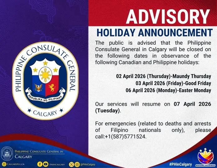 The public is advised that the Philippine Consulate General in Calgary will be closed on the following dates in observance of the following Canadian and Philippine holidays: