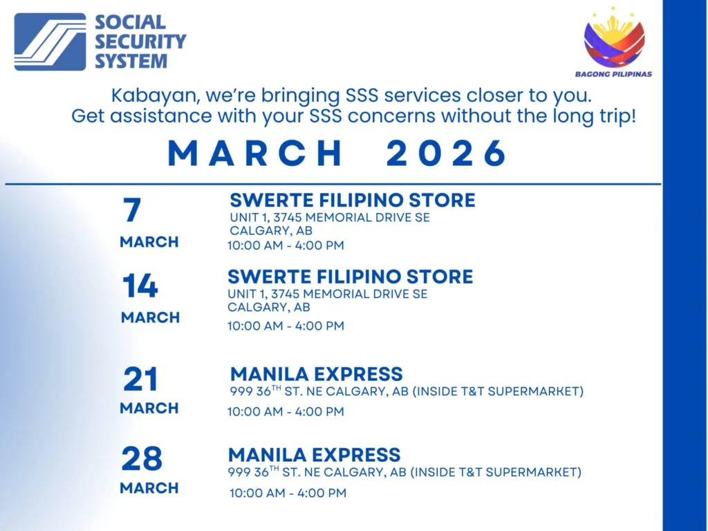 Social Security System (SSS) – Calgary Office will be open to serve our kababayan and assist with SSS-related transactions and inquiries.