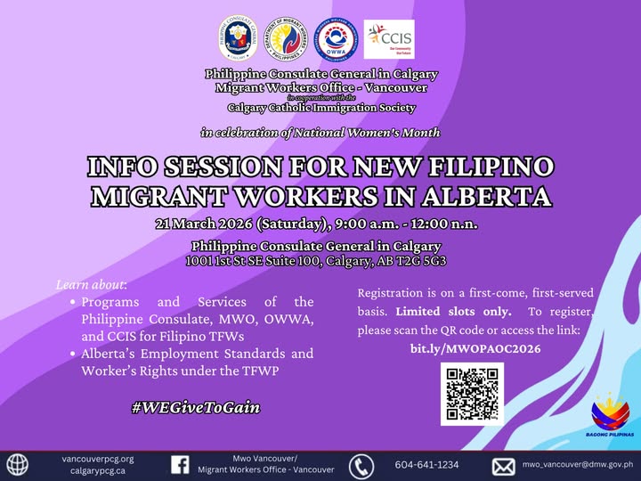 The Philippine Consulate General in Calgary, and the Migrant Workers Office – MWO Vancouver and OWWA, in cooperation with the Calgary Catholic Immigration Society, is pleased to invite you to the upcoming 𝐈𝐍𝐅𝐎 𝐒𝐄𝐒𝐒𝐈𝐎𝐍 𝐅𝐎𝐑 𝐍𝐄𝐖 𝐅𝐈𝐋𝐈𝐏𝐈𝐍𝐎 𝐌𝐈𝐆𝐑𝐀𝐍𝐓 𝐖𝐎𝐑𝐊𝐄𝐑𝐒 𝐈𝐍 𝐀𝐋𝐁𝐄𝐑𝐓𝐀 on 𝟐𝟏 𝐌𝐚𝐫𝐜𝐡 𝟐𝟎𝟐𝟔 (𝐒𝐚𝐭𝐮𝐫𝐝𝐚𝐲), 𝟗:𝟎𝟎 𝐚.𝐦. – 𝟏𝟐:𝟎𝟎 𝐧.𝐧. at the PCG Calgary!