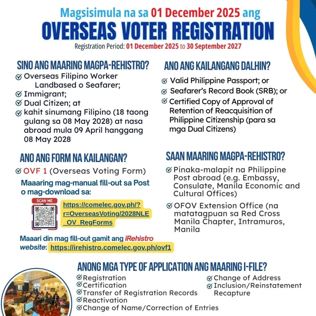 Filipinos residing in Alberta and Saskatchewan who were unable to register for the previous election, or whose registration records have yet to be transferred to their current residence in Canada, are highly encouraged to visit the Consulate to register or update their voter information ahead of the registration deadline on 30 September 2027.