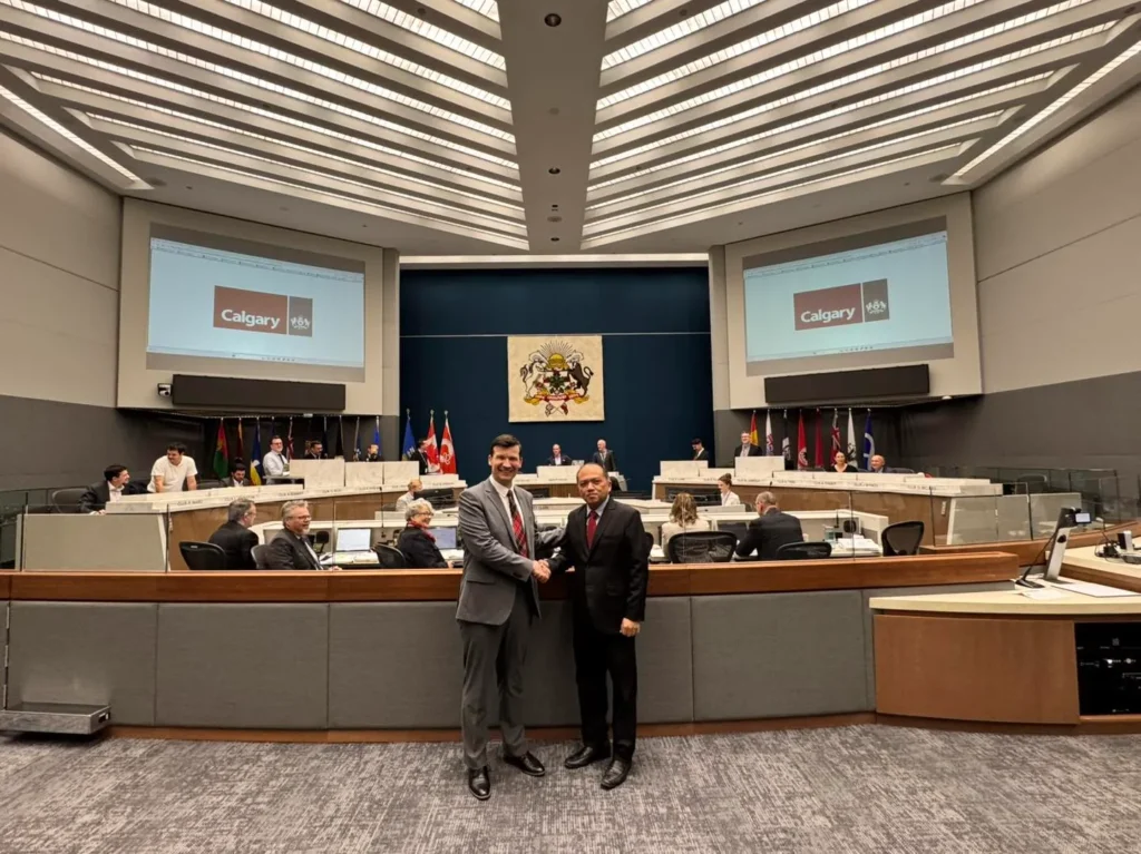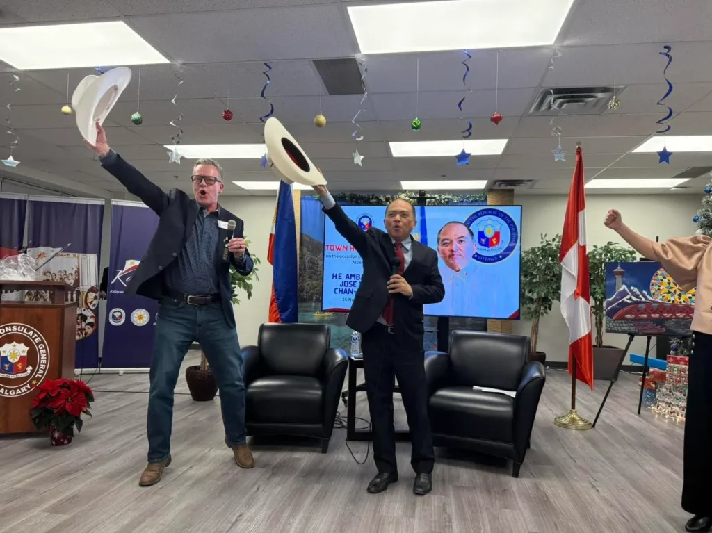 On the 3rd day of Philippine Ambassador to Canada Jose Victor Chan-Gonzaga’s visit to Alberta saw him in Calgary, where he was officially welcomed by Mayor Jeromy Farkas and the entire city council, gave a fireside chat with Canada West Foundation, a meeting with Edmonton International Airport, capped by a well attended Filcom meeting with representatives from Calgary and Southern Alberta in which the Ambassador was made an honorary Calgarian by receiving a White Hat, a time honored tradition of friendship of the city of Calgary.